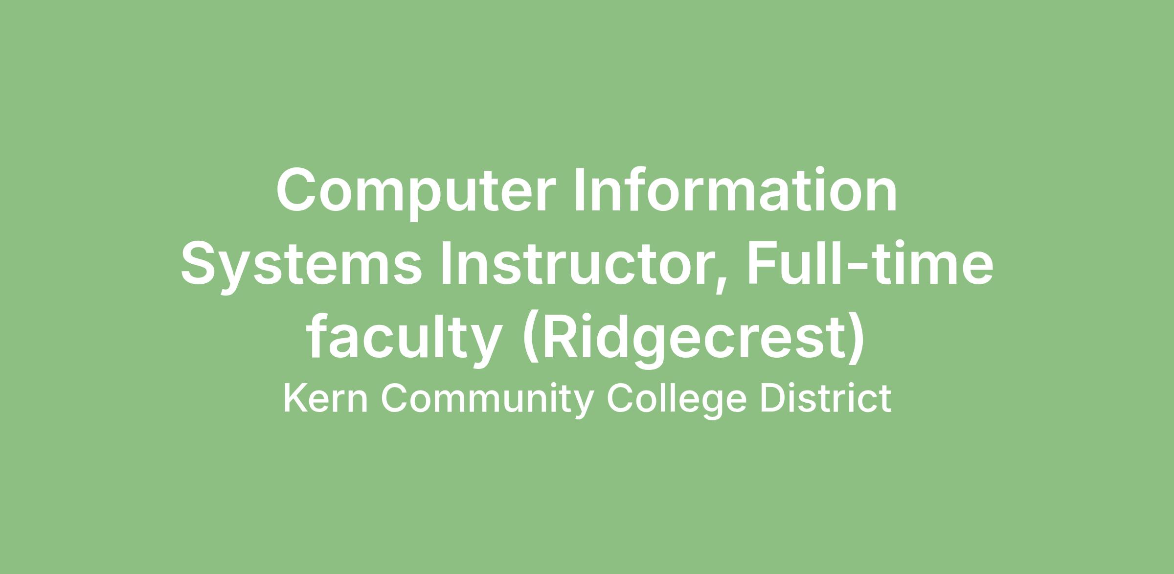 Cerro Coso Community College is seeking a full-time, tenure track, Instructor located at the Indian Wells Valley (IWV) Campus in Ridgecrest, California. We are seeking dedicated, experienced, and motivated individuals to provide leadership, engagement, and discipline expertise in continuing to move the program forward in innovative ways. As a full time faculty member at Cerro Coso Community College, successful candidates will demonstrate commitment to student success and equity through teaching and learning excellence.