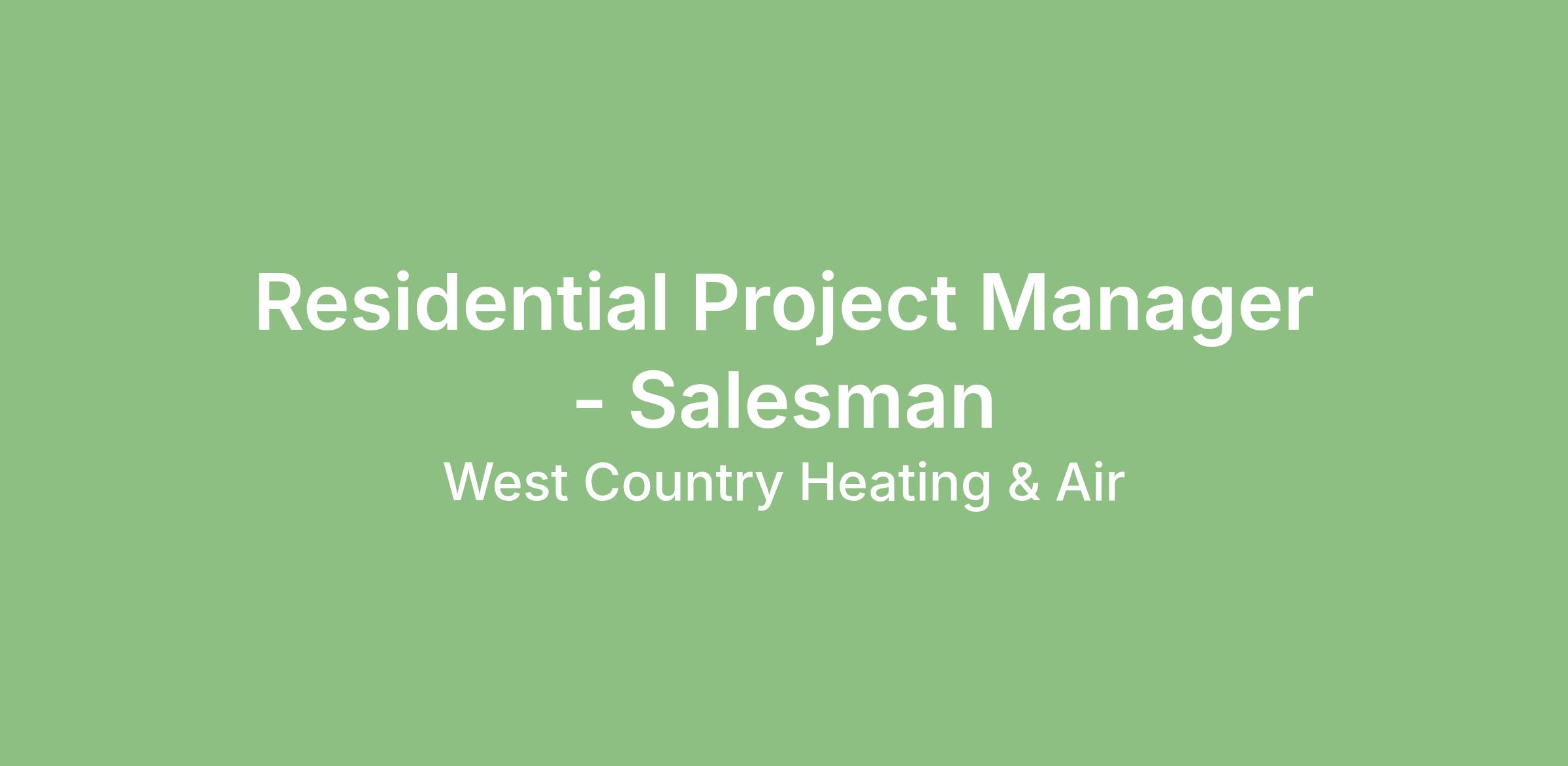 West Country Heating & Air of Hesperia, California is actively seeking to hire a full-time Residential Project Manager-Salesman to coordinate project activities, communicate with trade partners and clients, and visit job sites. This role is the keystone of communication flow in our company and increases revenue by building excellent customer rapport.